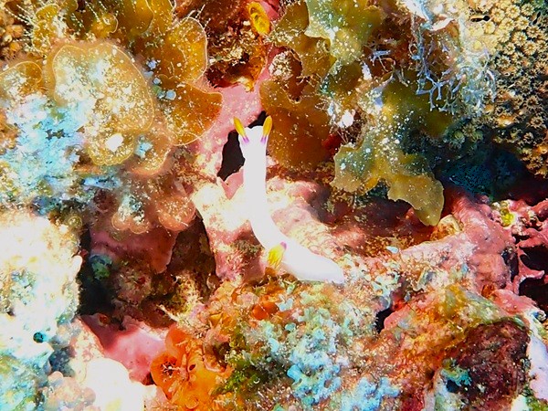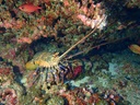 アカイセエビ | 閂Rock!は、洞窟と真っ白な砂地の両方が楽しめるポイント。 エントリー後直ぐに洞窟に入ったら、大きな海老が!その名の通り赤色のイセエビでした。 これまで見たイセエビ科の仲間は、岩の窪みにはまっていて全身を見ることは難しかったの ですが、ここでは、尾鰭まで綺麗にみることができました。 石垣島で見たカノコイセエビに似ていますが、こちらは細い方の触角に白い帯がありません。 |