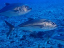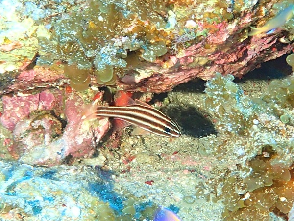 ミスジテンジクダイ | テンジクダイ科には、こげ茶か黒色と、白か黄色のストライプの魚が何種類かいます。 これまでに載せたのは以下の通りです。 ・オオスジイシモチ:黒線が細く、尾びれの前に黒斑あり ・コスジイシモチ:細いこげ茶線が8本あり、黒斑あり ・ミナミフトスジイシモチ:こげ茶線が太い、尾びれ前に斑点は無い ・ミミックカーディナルフィッシュ:毒のあるヒゲニジギンポに擬態、尾びれ前に小黒斑が多数 ・スダレヤライイシモチ:太い線と細い線が交互に入り簾の様、尾びれ前に黒斑点 (若いと黄色班の上に黒斑点) ・ヤライイシモチ:こげ茶線が細い、尾びれ前に黄色の斑点 ・リュウキュウヤライシモチ:茶線が8本、尾びれ前が白い ということで、今回まだ載せていない種を撮ることができました。海中では細かな比較ができ ないので、撮った時はミナミフトスジイシモチかと思いましたが、よかったです。 特徴は、三本の線が尾びれまでまっすぐ伸びていて、斑点や白い部分などはないことです。 ただし、これと違い、尾びれの前に濃いスポットがあるタイプもいるようです。 似たようなストライプのテンジクダイはまだまだおり、全制覇はむつかしいですね。 |