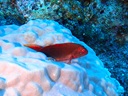 メガネゴンベ(白線無) | ペリリュー2や石垣島3で撮ったのには胴体に白い縦線がありますが、ここで観たのには 白癬はなく、体の色も少し濃い赤です。やはり、小笠原では体色が濃くなるのでしょうか? |
