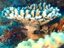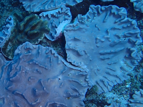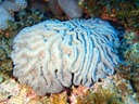 オオハナガタサンゴ | このサンゴはあまり大きくありませんが、その名の通り直径1mくらいの半球状にまで育つ そうです。 見た目が似ているノウサンゴは、盛り上がり部分がこの種のように二重になっておらず、 曲線が集まったもののようです。 また、柏島1で観た一字違いのハナガササンゴは花笠型で、どちらも科が違います。 |