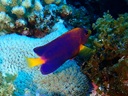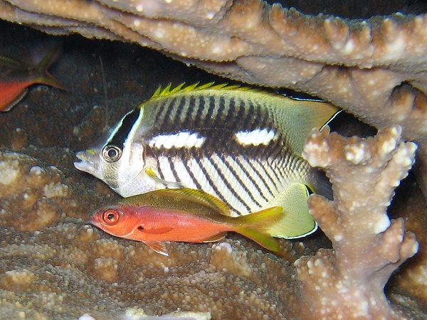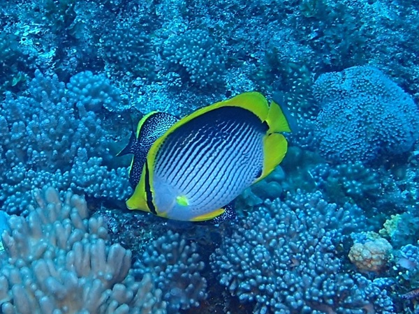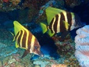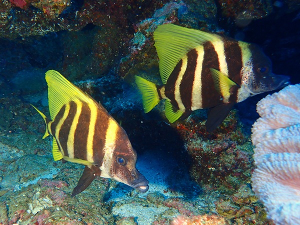 タテジマキンチャクダイ | 2004年のパラオ2で載せていますが、色映えが悪かったので載せ直しました。 ちょっと斜めになっているのが残念ですが、青と黄のコントラストが綺麗ですね。 |