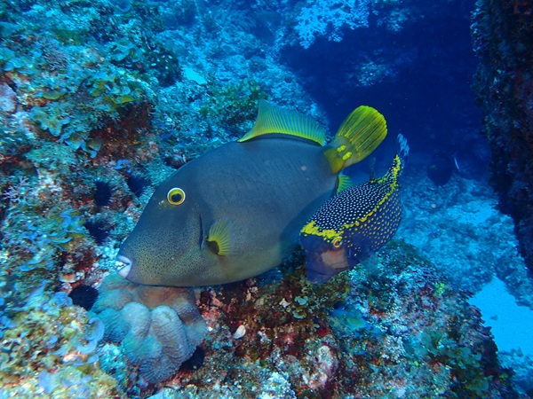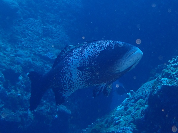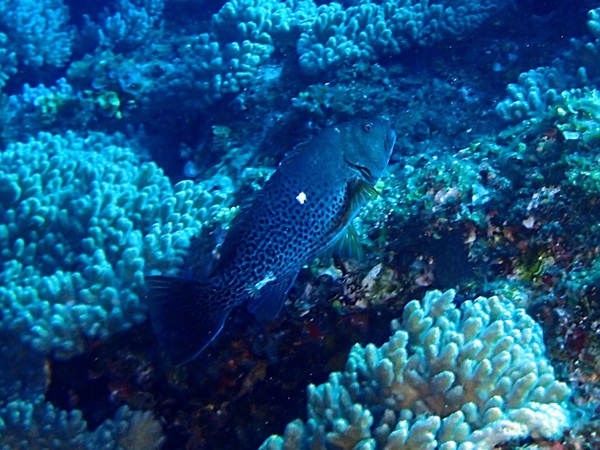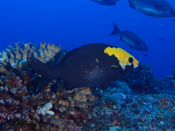 ミナミイスズミ(斑) | 黄色タイプの中でも、頭部だけに黄色が出るのは珍しいようで、婚姻色による変化なのか、 性転換で全体が黄色になる途中の色なのか、まだ解明されていないようです。 でも、この頭だけ黄色の斑タイプは、一番怖そうですね。 |