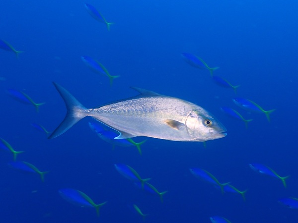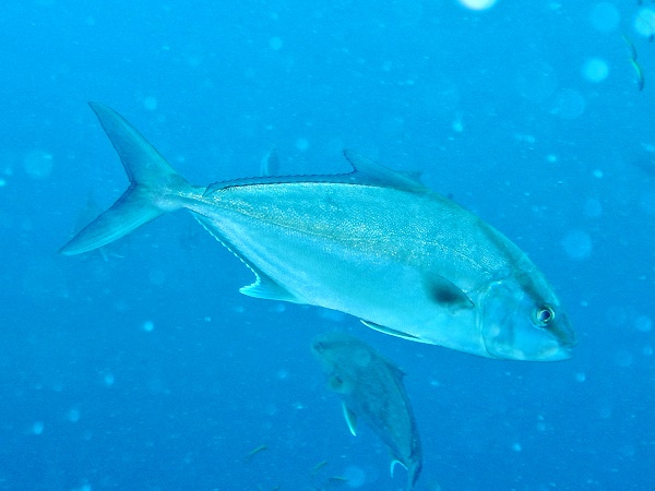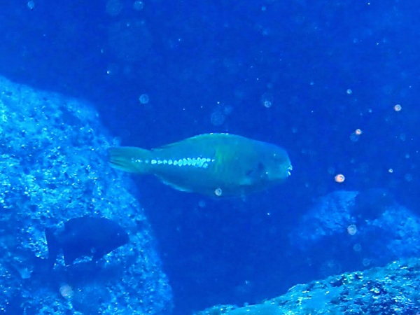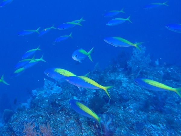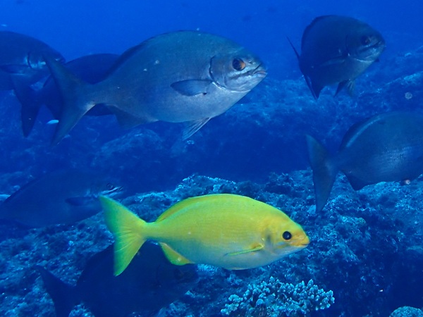 ミナミイスズミ(黄色) | この日の天狗の根は激流でした。なので、この魚の群れ以外は根に隠れて出てこられず、 短時間のダイビングになってしまいました。でも、希少な黄色が見れてよかったです。 イスズミの仲間で、黄色い個体が出るのはミナミイスズミだけだそうです。 小笠原ではササヨと呼ばれていますが、イスズミとは石又は磯に住むという意味です。 黒っぽい岩の間のグレーの群れの中に、2〜3匹この色が混ざっていると目立ちますね。 |
