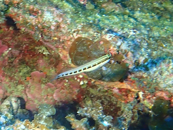 ヒトスジギンポ | 柏島2で載せましたが、全身が写っておらず、体色も濃いツートーンでちょっと異質でした。 今回は全身で、体色も図鑑に載っているような標準的な個体です。 ただし、お腹の黒いラインが破線のこのタイプと、黒い直線のタイプの2種あるそうです。 |